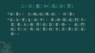 此影片介紹「三位數加減估算」之運算原則,先帶領學生運用點數的方式,透過向上數及向下數來找出指定之三位數最接近幾百,學會如何「估算」後,再做五個練習題,以熟悉「三位數加減估算」應先估出指定數字,然後再進行加減計算之原則。
